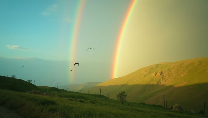 - 二次反射:有时,你会看到两条彩虹。主彩虹是由水滴内部的一次反射形成的。而次彩虹则是由水滴内部的第二次反射形成的。