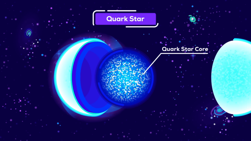 有的科学家推测,在更高的极端温度和压力下,中子的简并压力也被克服了,中子星上的中子被迫合并并溶解为组成它的夸克,从而形成了夸克物质的超致密相。在这种状态下,应该会出现新的平衡,因为在夸克之间会出现新的简并压力以及排斥电磁力,并阻碍重力的崩溃,这样一颗夸克星就诞生了。