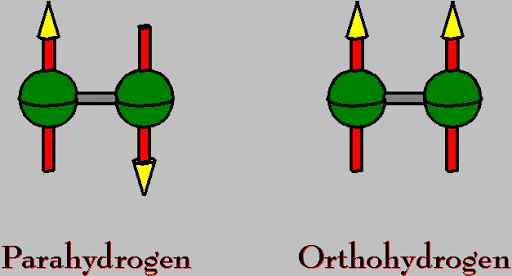 其实这是氢气分子的自旋异构体,在正氢中的两个氢原子核的自旋是相同的,而仲氢中的两个原子核的自旋方向相反。所以正氢的自旋量子数 J相当于奇数值,仲氢的 J 则相当于偶数值。仲氢分子的磁矩为零,正氢分子的磁矩为质子磁矩的两倍。