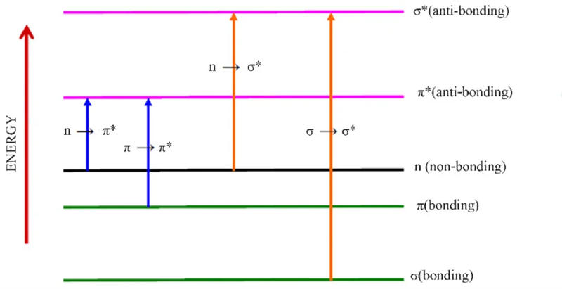 在紫外光谱中,电子跃迁是最重要的。键合电子从入射波长获得能量,如果足够,它们会被提升到更高的能级。如图所示,根据所涉及的键的类型,电子会被激发到几层。