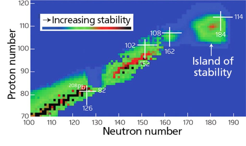 科学家目前还在通过粒子加速器不断地试图合成更重的元素。这样的工作不仅仅是为了合成新元素,而是科学家相信,在原子序列164号元素附近,会存在一个元素稳定岛(island of stability),处于这个位置附近的元素将能够稳定存在。